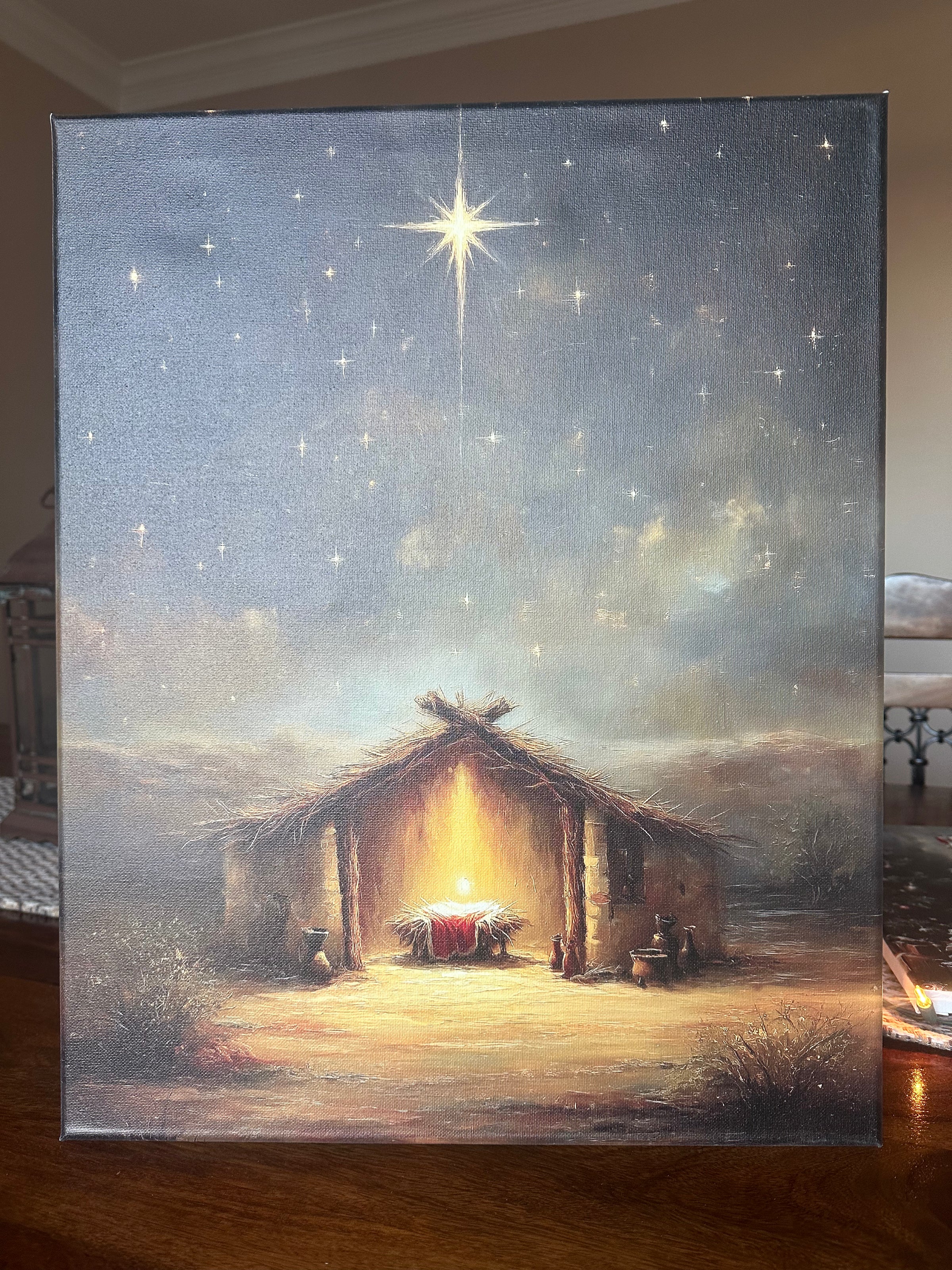 Celebrate the sacred heart of Christmas with this reverent UV printed manger scene. This timeless depiction captures the profound beauty and spiritual significance of the nativity, rendered with elegant detail and warmth. The fade-resistant print honors this cherished moment with dignity and grace, making it a meaningful addition to holiday décor or year-round. Perfect for those seeking to reflect on the deeper meaning of the season, this piece invites contemplation and reverence into your home.